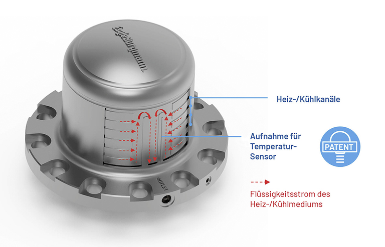 Die Kombination aus patentierter Sensor-Aufnahme und speziellen Heiz-/Kühlkanälen macht den SensoCan zur idealen Lösung für temperatursensible Applikationen, die präzise überwacht werden müssen. Die Temperatur wird direkt im Entstehungsbereich gemessen. Die Heiz- oder Kühlleistung wird optimal verteilt.