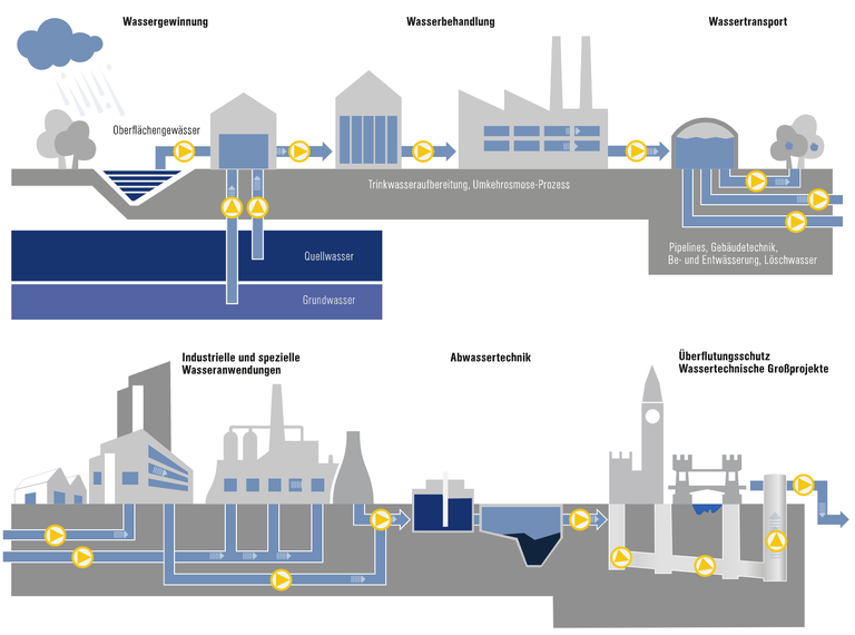 So vielseitig wie das Medium selbst ist, so sind es auch die Prozessanforderungen in den unterschiedlichen Wasseranwendungen. Von der Wassergewinnung, Wasserverteilung und dem Wassertransport, über die Nutzung, die Wasseraufbereitung und Abwasserbehandlung bis zum Überflutungsschutz – eines haben alle Wasseranwendungen gemein: