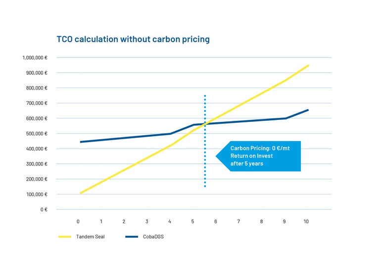 Comparing a conventional seal total cost of ownership to a CobaDGS retrofit, shows a breakeven point after approximately five years of operation. After this point your zero-emission seal upgrade has been paid for along with the eliminated environmental impact.