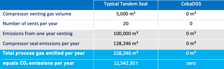 Venting a single compressor and associated piping, releases approx. 100,000 m³ of process gas/methane into the atmosphere every year. A similar amount – in our example over 128,000 m³ – is emitted from seal leakage. The total gas emitted per year and turbo compressor is around 228,000 m³, which is equivalent to approximately 12,542 metric tons of CO2.